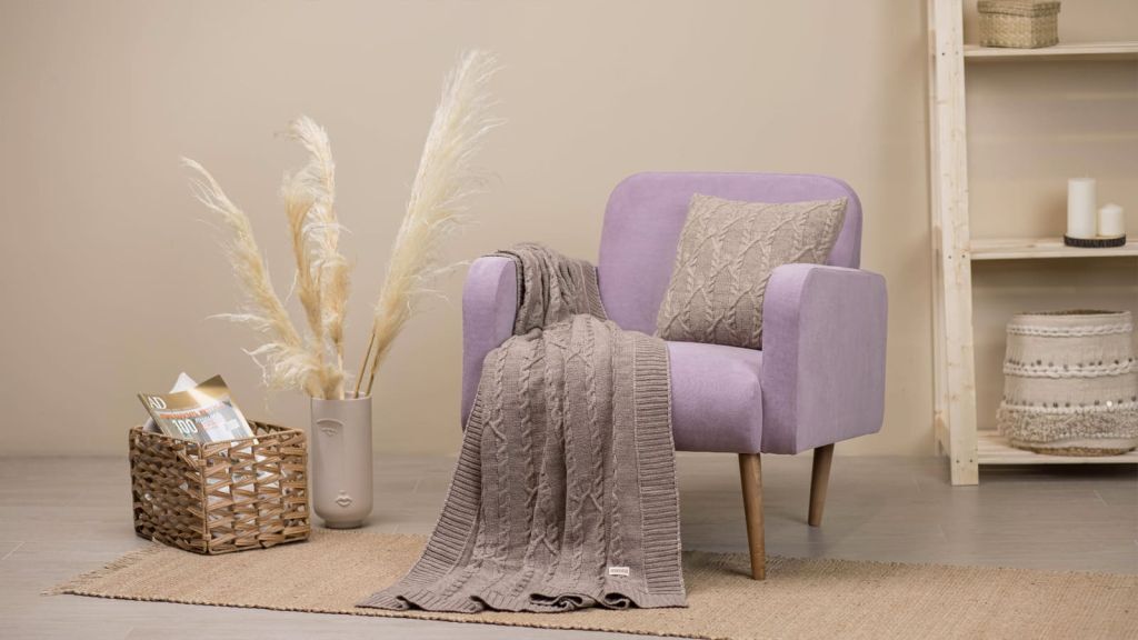 Модель будет стильно смотреться в интерьере гостиной благодаря крупной вязке и красивым, глубоким цветам.